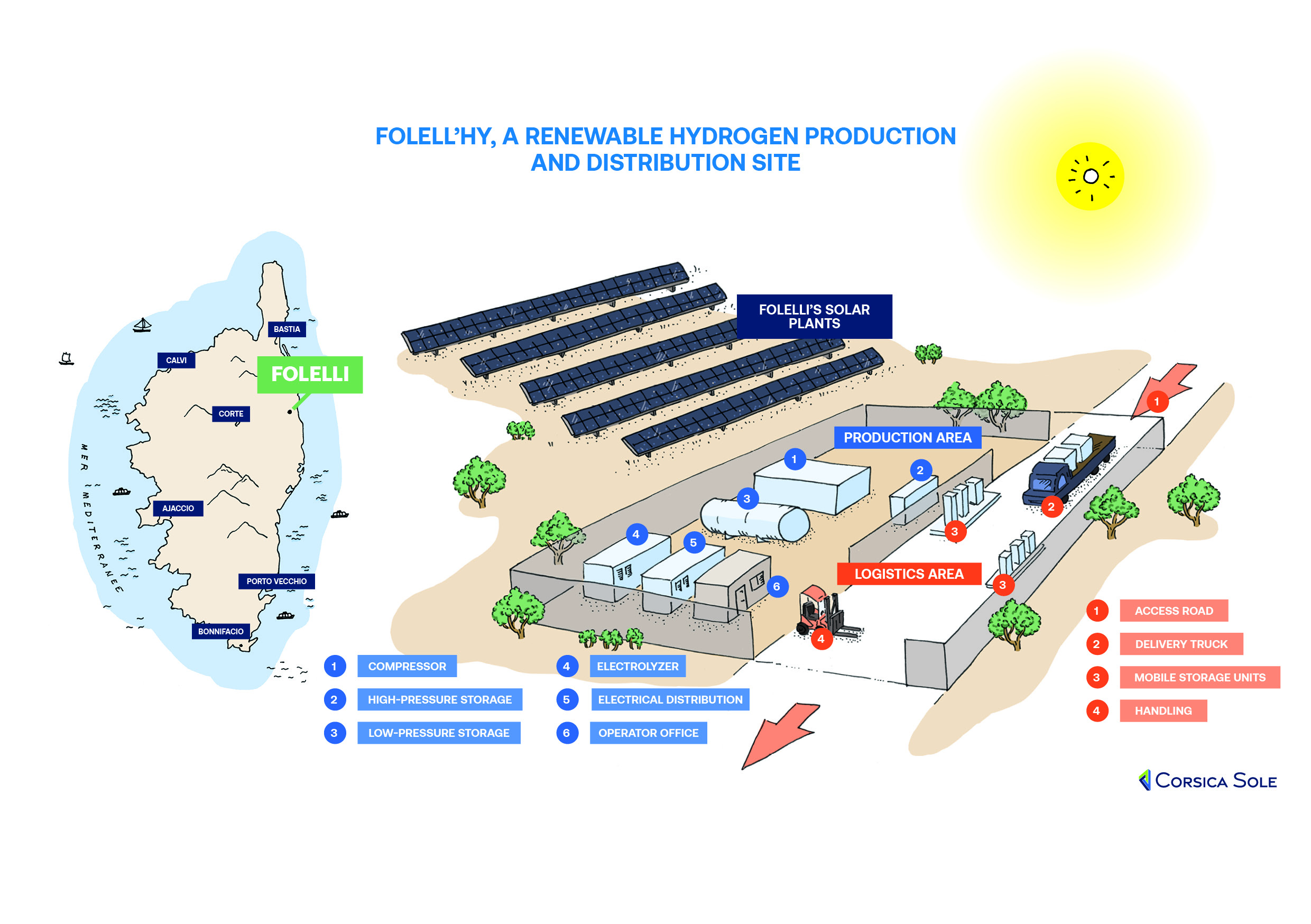 Il progetto si svolgerà dal 2024 al 2028 in Corsica, con la creazione di un sito sperimentale, Folell’Hy, situato presso la centrale solare di Folelli, vicino a Bastia.