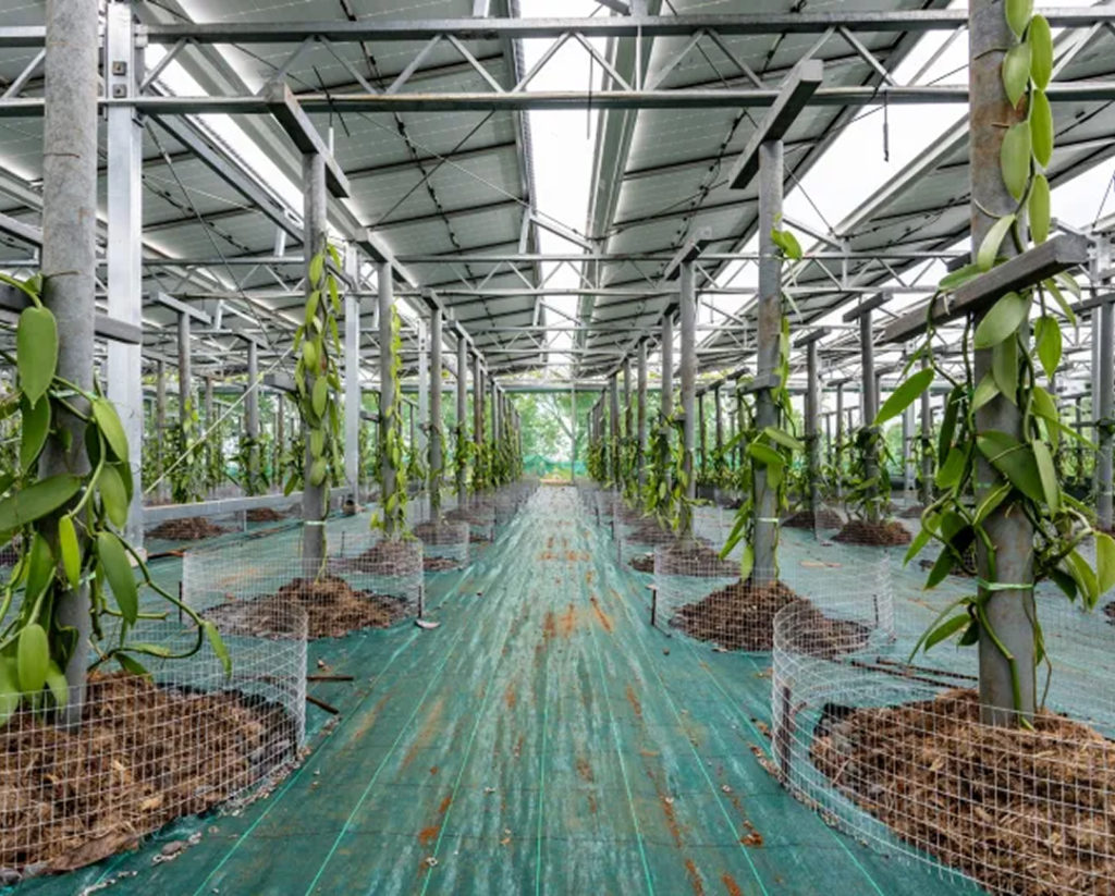 Ce projet novateur créé en partenariat avec une coopérative agricole locale marie agriculture de terroir et énergie solaire durable. Des ombrières photovoltaïques ont été conçues pour protéger spécifiquement les plantations de vanille, filtrant jusqu’à 75 % de la lumière et maintenant une température optimale entre 25 °C et 32 °C. Ce microclimat contrôlé protège les cultures, diminue l’utilisation de produits chimiques et renforce la résilience climatique des exploitations.