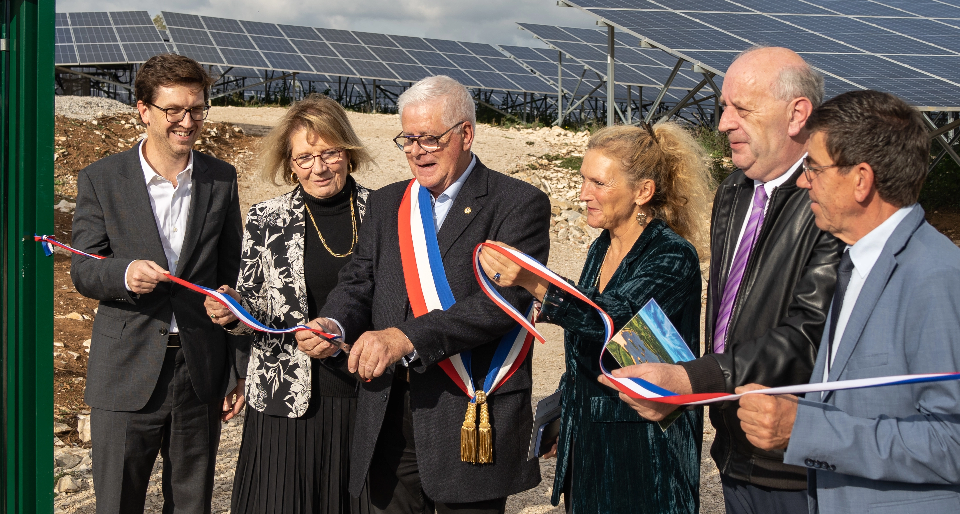 Coupé de ruban à l'occasion de l'inauguration de la centrale solaire de Picarreau en présence de Michael COUDYSER, Directeur Général de CORSICA SOLE ; Dominique PELLIN, Maire de Picarreau ; Danielle BRULEBOIS, Députée du Jura ; Dominique BONNET, Président de la Communauté de Communes de Arbois Poligny Salins Coeur-du-Jura ; Sylvie VERMEILLET, Sénatrice du Jura, Dominique CHALUMEAU, 1er vice-Président, Conseil Départemental du Jura