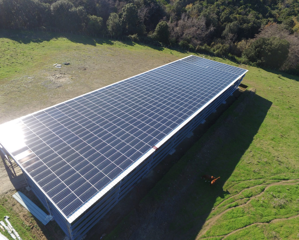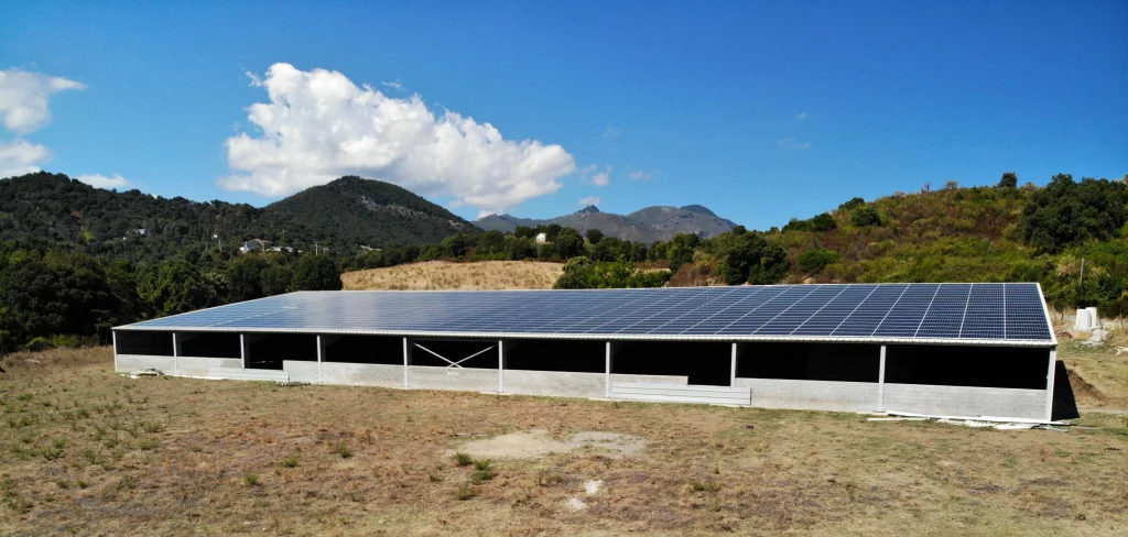 La toiture solaire de Pinia en Corse est installée sur d’un hangar agricole de 1 400 m². Développée à Ghisonaccia en partenariat avec la SCEA Curellu, elle a été conçue par les équipes de Corsica Sole pour à la fois pour répondre aux besoins de d’exploitationagricoles et énergétiques.